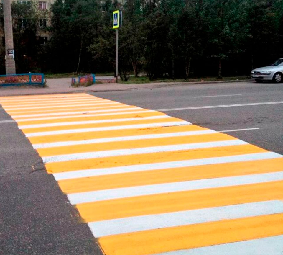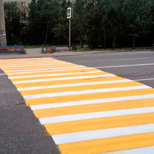 Мы осуществляем нанесение разметки пешеходных переходов холодным пластиком белого и желтого цвета, или белым пластиком и желтой краской, а так же с применением противоскользящих покрытий.